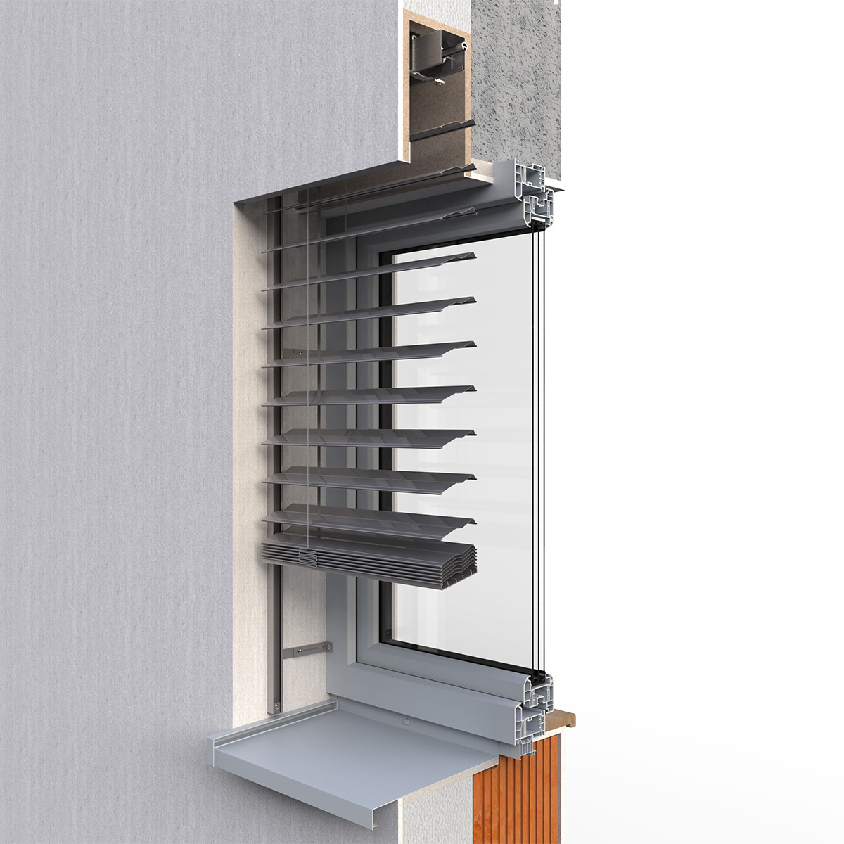 Vonkajšie žalúzie, ktoré nie je možné upevniť do ostenia cez horný nosič, sú inštalované v samonosnej konštrukcii pomocou vodiacich líšt. Nábal lamiel je uschovaný za krycím plechom. Ideálne pre malé okenné výrezy.